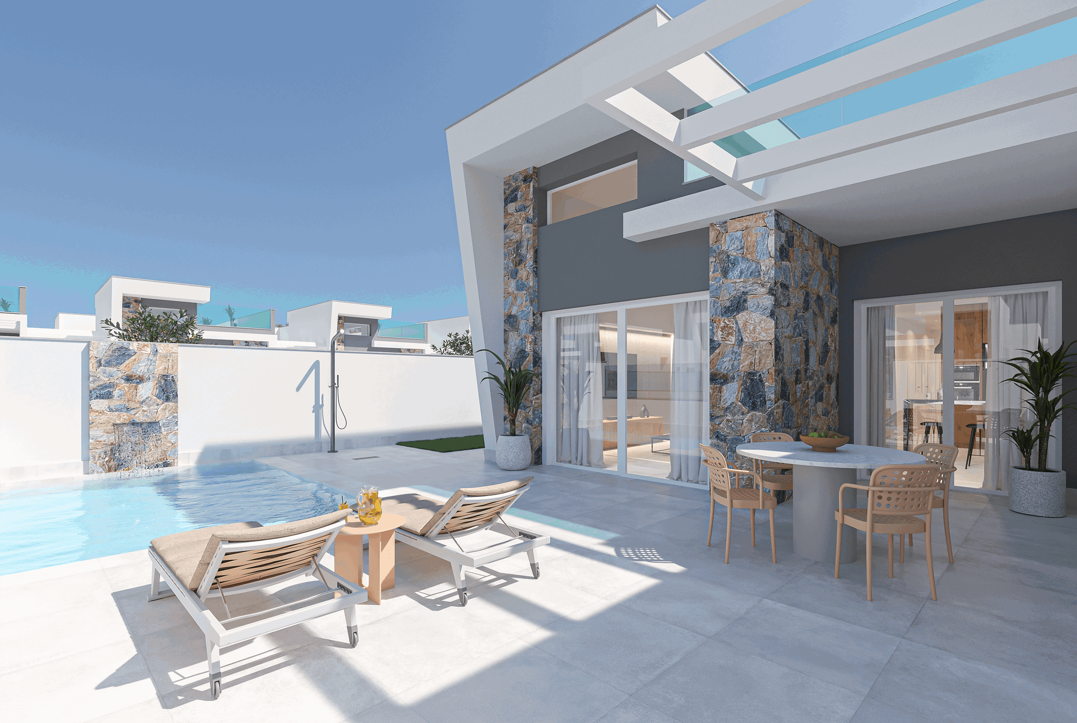 Situées dans le Serena Golf de Los Alcazares, à seulement 1,5km du bord de mer, ces villas quatre façades disposent de tout ce dont vous pouvez rêver. Une grande pièce de vie avec cuisine ouverte (réfrigérateur intégré, plaque de cuisson, lave-vaisselle, micro-ondes, four et hotte aspirante inclus), 3 chambres avec placards encastrés, 2 salles de douche entièrement parachevées, une piscine privée, une cuisine d’été sur le solarium (terrasse de toit), un emplacement de parking sur votre terrain.